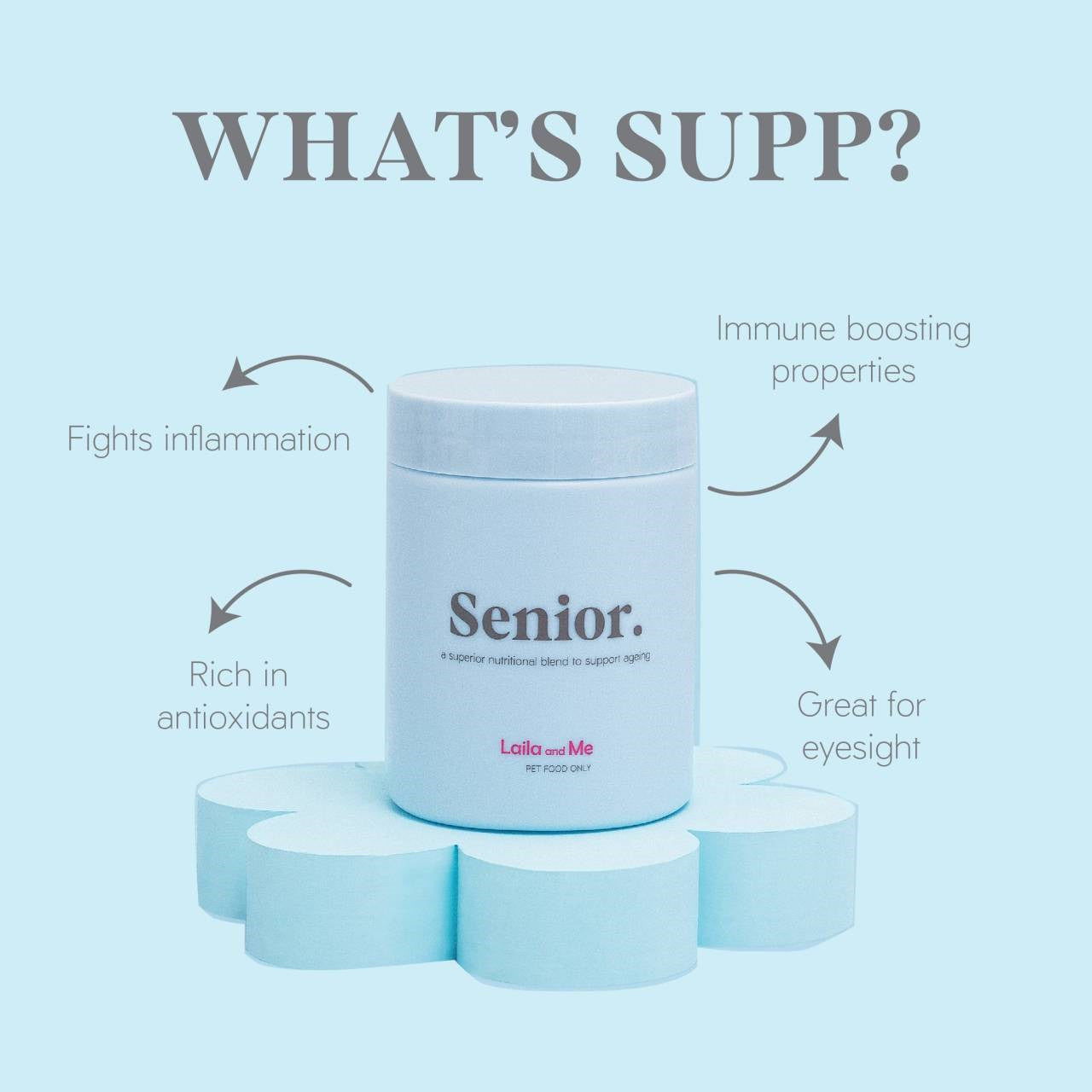 The Laila & Me Senior Pet Food Supplement is an Australian-made fine-powder pet food supplement that doubles as a food topper and is an all-encompassing supplement for elderly pets that helps improve immunity, digestive health, joint health, cognitive health, and eyesight.
